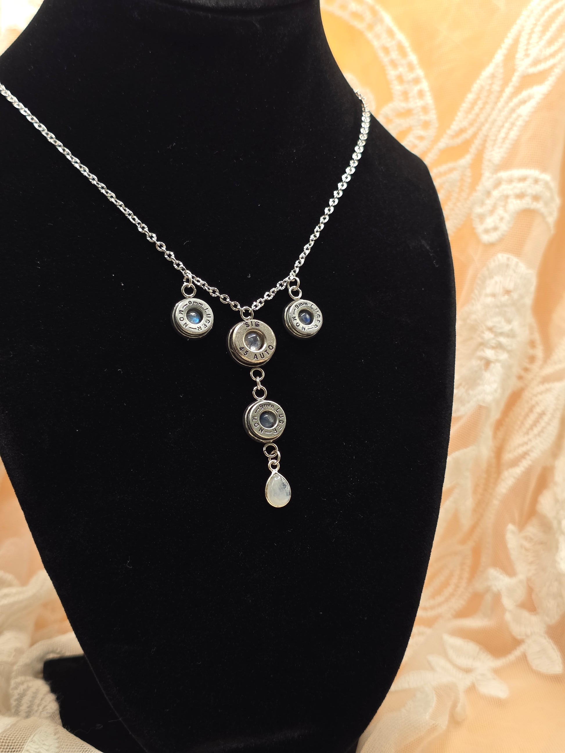Éclipse de Chair version mini, plus allégée qye la version originale associe 3 douilles 9mm, 1 douille .45 ACP (réelles, tirées au Texas par mes soins), chacune sertie de Pierres de lune 4 et 5mm pour un effet hypnotisant.